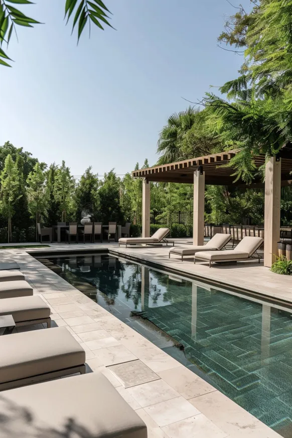 This pool deck is all about clean lines, simplicity, and serene luxury. The soft neutral tones of the loungers complement the warm stone tiles, creating a peaceful yet stylish atmosphere. The pergola provides perfect shade, ideal for those sunny afternoons when you just want to relax without the glare. The lush greenery surrounding the space offers privacy, while the reflective pool adds that extra touch of elegance.