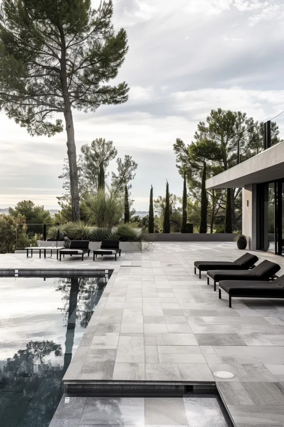 This pool deck design is all about simplicity and elegance, with a refined minimalist approach. The large, rectangular pool is framed by sleek, neutral-toned stone tiles that create a seamless transition between the pool area and the surrounding landscape. Black lounge chairs offer a chic, modern touch, and the tall, sculptural trees lining the property provide a sense of privacy and calm. The expansive deck and open space give this design a luxurious, airy feel.