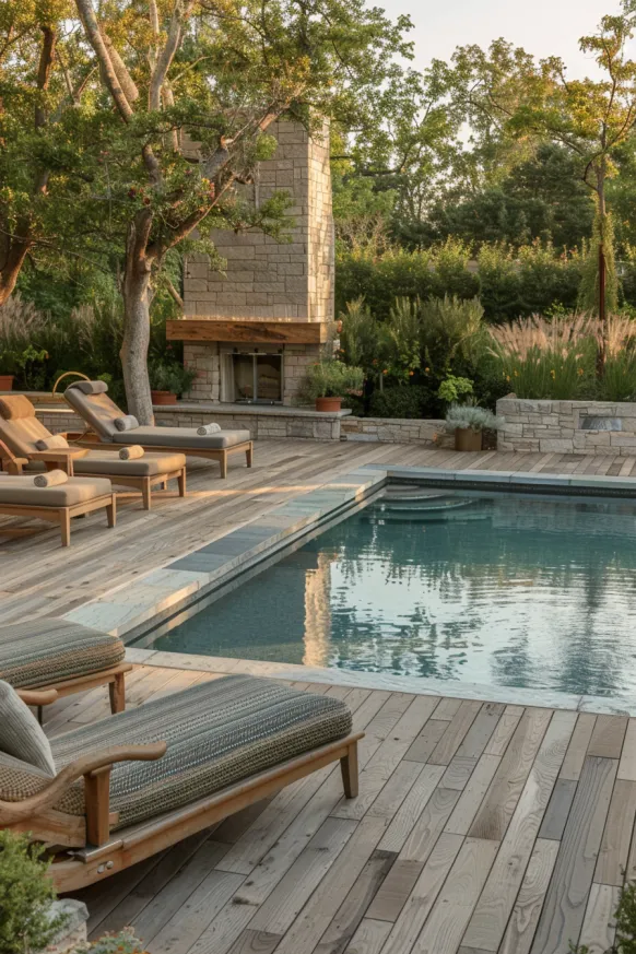 This pool deck design blends rustic charm with modern comfort. The wooden deck wraps around the pool area, creating a warm, inviting space. The highlight of the design is the beautiful stone fireplace, offering a cozy spot to gather around after a swim or during cool evenings. Lounge chairs with soft cushions are strategically placed near the pool, providing the perfect spot for relaxation while surrounded by lush greenery and vibrant flowers.