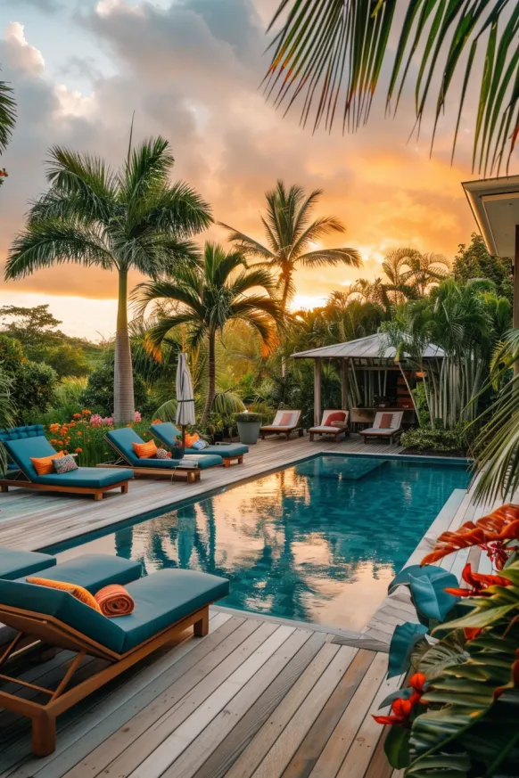 What I absolutely love about this design is the warm and intimate feel it gives off, even with the bright colors and lively ambiance. The combination of nature and comfort really makes this a space that feels like a personal escape. If you’re into vibrant, laid-back spaces with a tropical vibe, this pool deck will definitely inspire you to bring that little slice of paradise to your own home!
