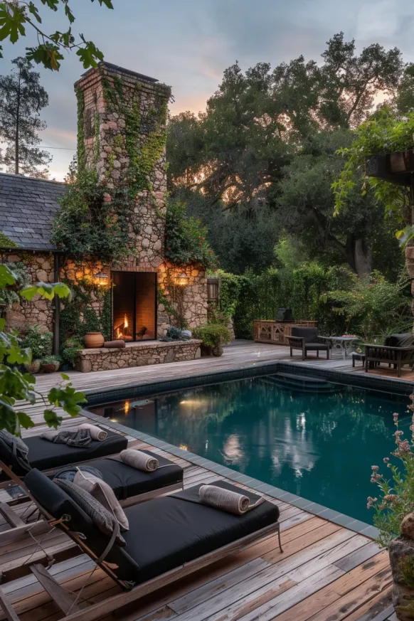 This pool deck design brings together rustic elegance with a touch of nature. The rich, wooden deck surrounds the sleek, blue pool, while the charming stone fireplace creates a cozy focal point. Ivy climbs the tall stone chimney, adding a natural element to the modern design. Comfortable lounge chairs invite you to relax by the pool, and the soft lighting from the fireplace and surrounding fixtures adds a warm, inviting glow to the space.