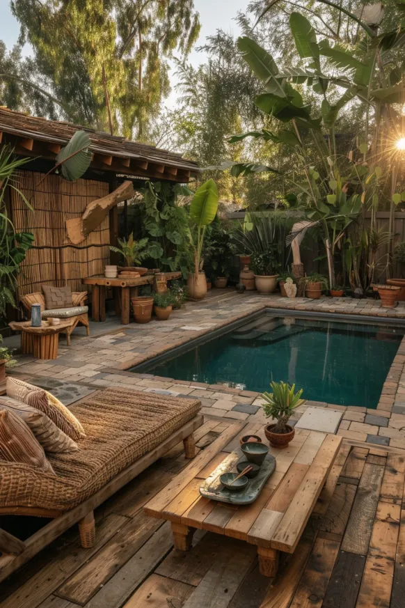 This pool deck is a little slice of paradise, showcasing rustic charm with a cozy, laid-back atmosphere. The pool area is surrounded by natural stone tiles, and the space is filled with tropical plants that give it a refreshing vibe. A bamboo-covered hut adds a bit of exotic flair, making it the perfect spot to lounge and unwind. The furniture here is minimal but super comfortable, with large cushions and a wood-slatted table to tie everything together in a natural, earthy style.