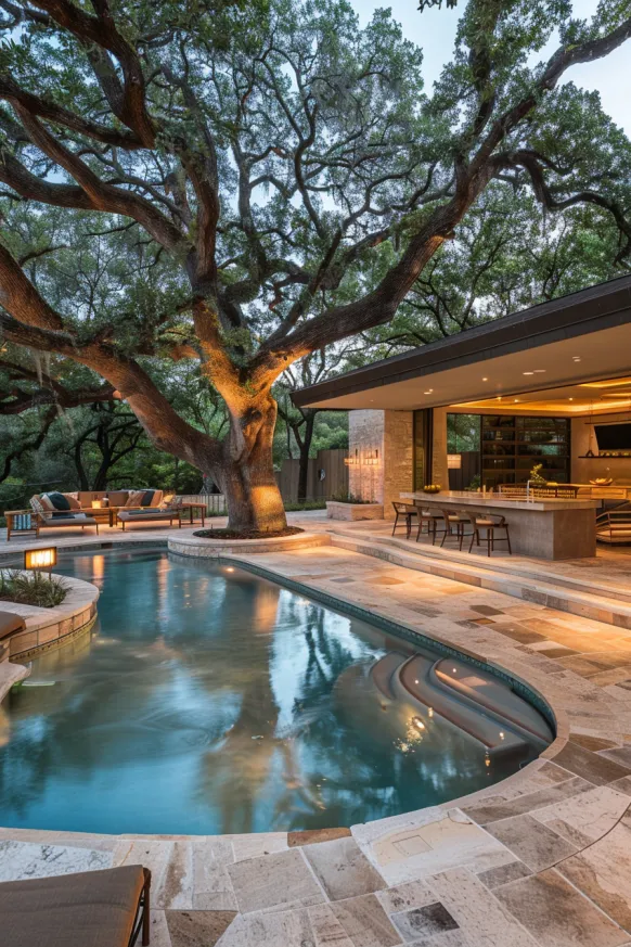 This pool deck design is a perfect balance of modern luxury and natural beauty. The sleek, stone tiles surround the pool, while large, mature trees provide a canopy of shade and a sense of tranquility. The pool is gently curved, adding a soft flow to the layout, and the outdoor living area with comfortable seating and a stylish bar area seamlessly connects to the interior of the house, making it ideal for both relaxation and entertaining. The warm lighting from the pool and the outdoor lamps adds an inviting glow as the day turns to night.