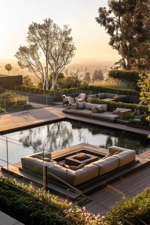What truly stands out for me in this design is how the modern lines and natural materials come together so effortlessly. The fire pit, positioned in the center, offers a perfect spot to unwind, and the view of the landscape is absolutely breathtaking, especially with the soft golden hues of the sunset. If you’re someone who loves a peaceful and elegant retreat with a contemporary vibe, this pool deck will definitely inspire you to transform your outdoor space into something truly magical!