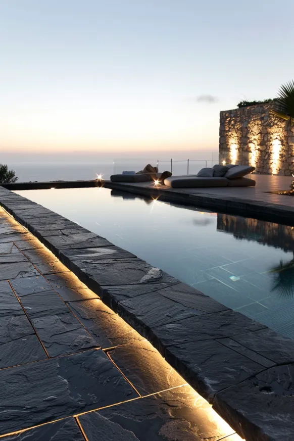 This pool deck design perfectly combines simplicity and luxury. The sleek black stone tiles frame the pool, while integrated lighting along the edges creates a subtle yet elegant ambiance as the sun sets. The modern furniture, placed in the background against the vast ocean view, gives off a tranquil vibe. The minimalist approach allows the natural beauty of the surroundings to shine through, with the clean lines of the design emphasizing the view beyond.
