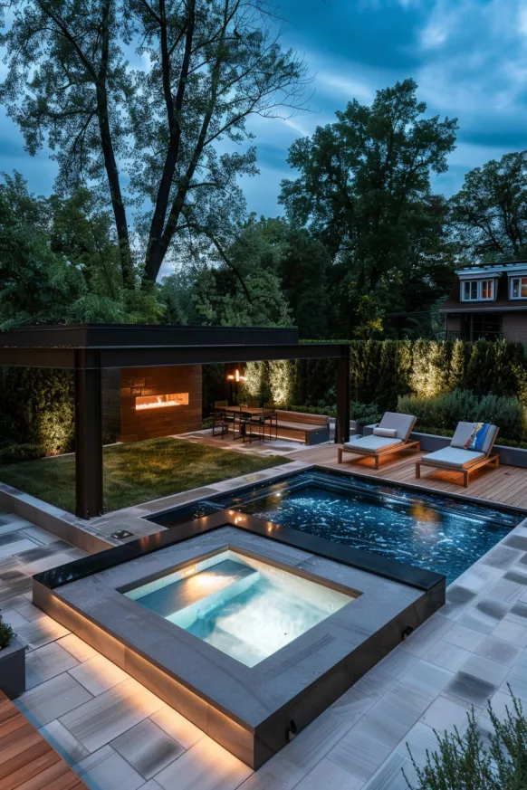 I’m totally in love with how this design blends modern elements like the clean lines and geometric shapes with the cozy warmth of the fire feature. The lighting not only highlights the stunning features but also sets a mood that’s both inviting and relaxing. It’s just the kind of setup that makes you want to kick back and enjoy a peaceful evening or host a cozy gathering with friends! The combination of the soft, natural surroundings and the contemporary vibe creates such a calming yet stylish atmosphere.