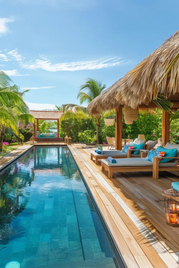 This stunning pool deck exudes tropical charm with its natural wood finish and lush greenery surrounding the area. The cozy loungers, adorned with colorful pillows, invite you to relax and enjoy the sunshine. The bamboo roofed cabana adds a playful touch of island vibes, providing a perfect spot for lounging or enjoying drinks by the water. The vibrant flowers and palm trees set a vibrant backdrop, while the pristine pool reflects the clear blue sky.