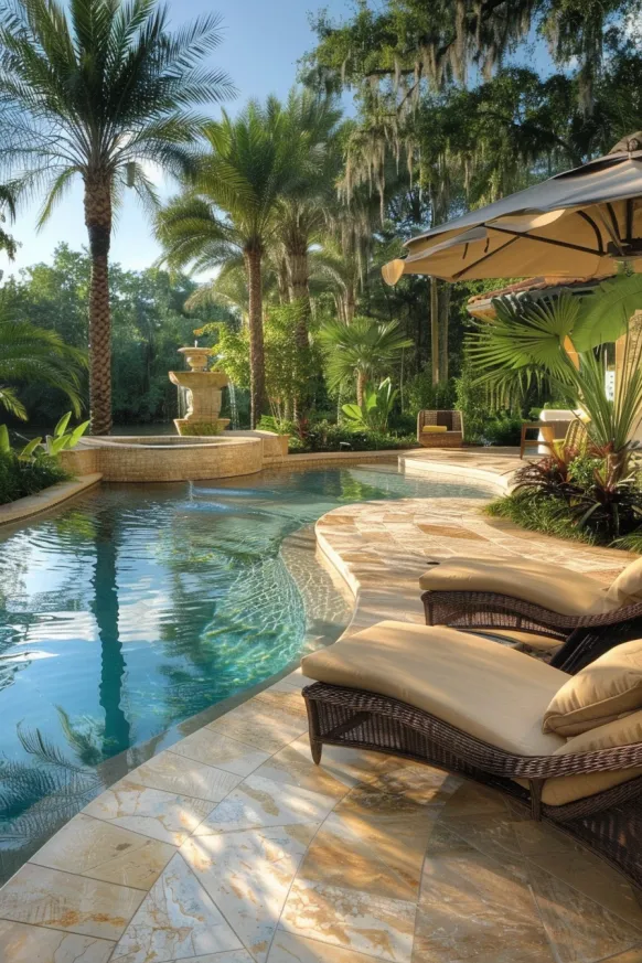This pool deck brings the ultimate tropical vibes, complete with towering palm trees and a stunning fountain as the centerpiece. The warm, golden tiles of the deck wrap around the pool in a soft, curving pattern, creating a relaxing and inviting space. The stylish wicker loungers provide a perfect place to kick back and unwind under the shade of an umbrella, with lush greenery filling the background for added privacy and tranquility.