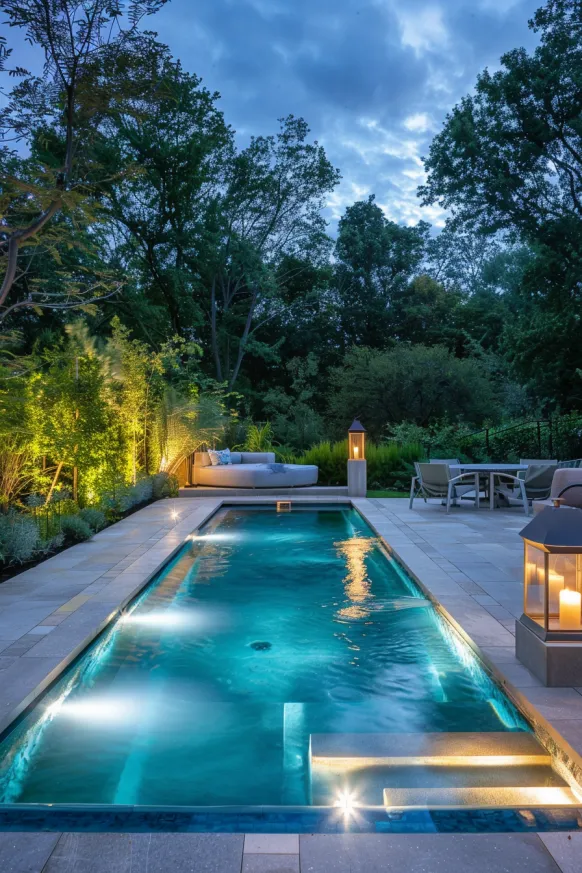 I absolutely love how the lighting brings everything to life in this setup. It feels like the pool could be the perfect place for a peaceful evening with friends or family. The way the lights shine softly through the trees gives the whole space a cozy, almost magical vibe. It’s simple, yet elegant—just the kind of backyard oasis we all dream of!