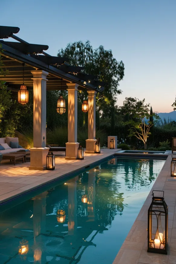 This gorgeous poolside design combines rustic charm with contemporary elegance. The pool is softly illuminated by strategically placed lighting along its edges, creating a serene and inviting glow. The surrounding stone steps and lush landscaping are subtly lit, with lantern-style lights adding an extra layer of warmth to the space. A cozy seating area under a pergola provides the perfect spot for enjoying the evening, complete with additional lighting to make the whole area feel like an outdoor living room.