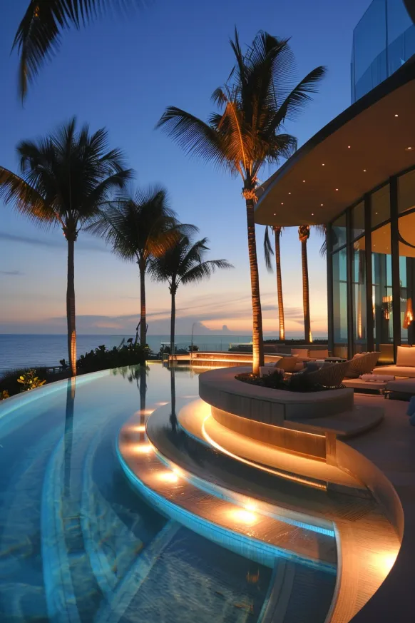This ultra-modern pool design takes full advantage of its oceanfront location, creating an open and seamless transition from the indoors to the outdoors. The pool features subtle, built-in lighting along the edges that perfectly highlight the sleek, contemporary curves. The soft, warm light beautifully contrasts with the vibrant blues of the water, adding a calming glow to the space. Tall palm trees gently frame the area, their leaves swaying in the ocean breeze, and the lighting continues to flow seamlessly, providing both functional lighting and dramatic beauty.