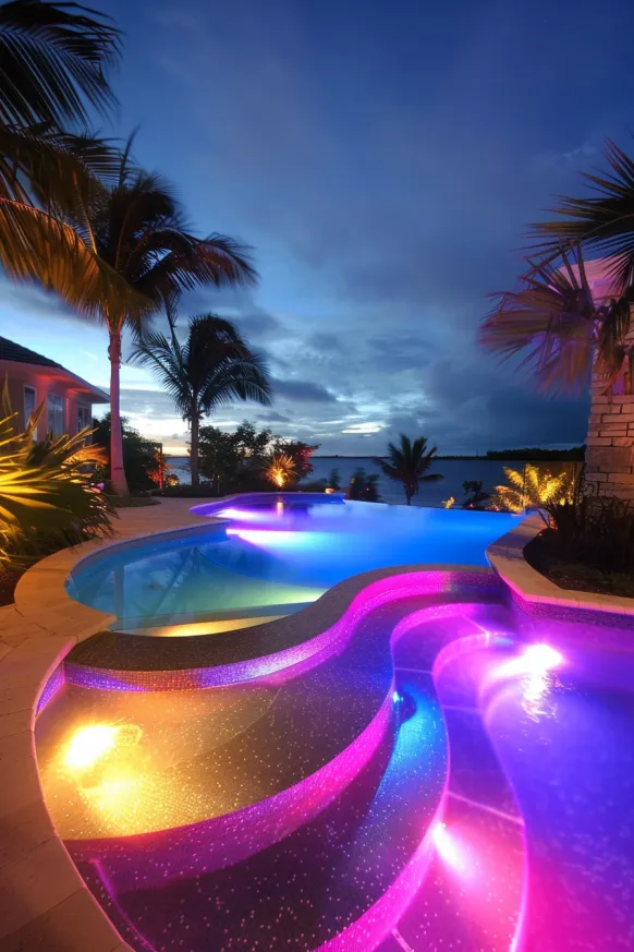 This pool design is an absolute showstopper, with its stunning, vibrant lighting creating a mesmerizing glow against the darkening sky. The pool features soft curves that are outlined by dynamic, multi-colored LED lights, which shift in beautiful hues of blue and purple. The surrounding greenery and palm trees are illuminated by warm lights that add depth and texture, making the whole space feel like a tropical dream. The backdrop of the sunset over the water only enhances the beauty of the lighting effects.