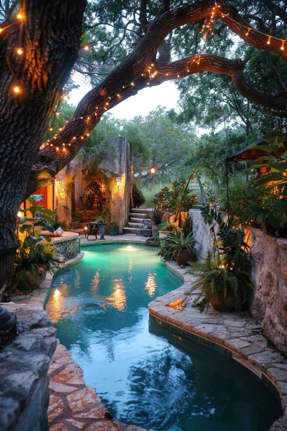 This stunning poolside setup is made even more magical by the fairy-tale glow of twinkling string lights hanging from the pergola. The lights illuminate the outdoor seating area, adding a soft, warm glow to the space, while the pool itself sparkles under the lights. With lush plants lining the edges and the stone patio enhancing the rustic charm, this space is perfect for both day and night relaxation.