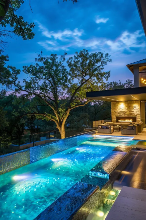 This pool design is the perfect blend of modern elegance and natural beauty. The sleek infinity-edge pool stretches out toward the horizon, offering a breathtaking view of the landscape. Soft, built-in lighting along the pool’s edge illuminates the clear water, creating a tranquil, almost magical effect. The surrounding patio is equally stunning, with carefully placed lights highlighting the minimalist architecture and enhancing the overall ambiance.