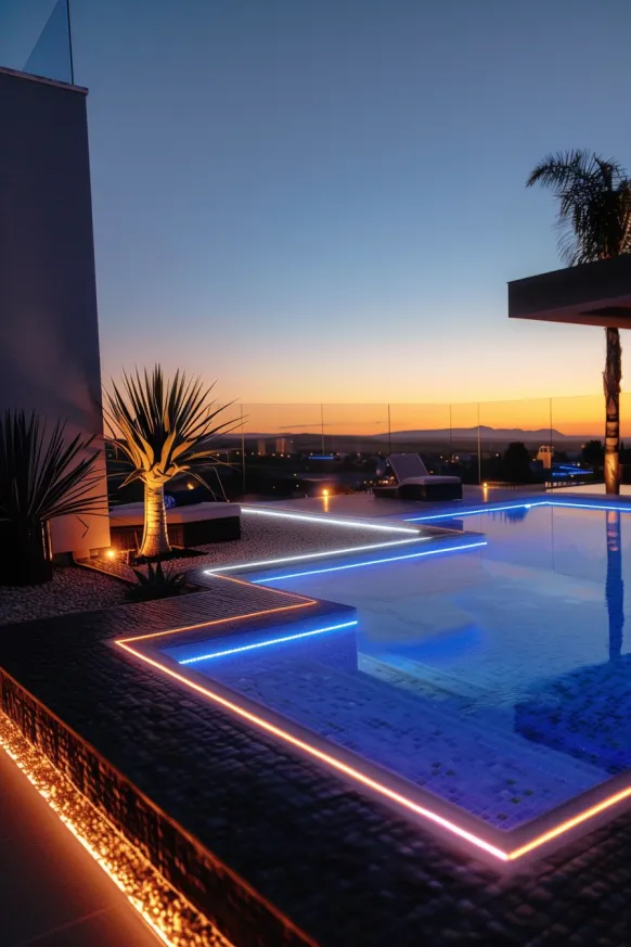 This modern pool design offers a sophisticated look, with its clean, geometric lines and vibrant lighting that creates an almost futuristic feel. The pool is outlined with soft, colorful LED lights that illuminate the edges, with the blue and purple hues adding a pop of energy to the sleek, black tile surroundings. The illuminated pool sits against a stunning backdrop, with a glass railing providing an unobstructed view of the horizon. The overall effect is bold and chic, making the space feel both luxurious and ultra-contemporary.