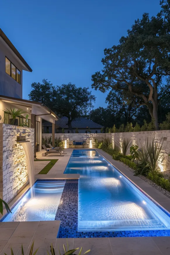 This stunning pool design features sleek stone walls and a long, tranquil pool with built-in lighting that softly illuminates the water’s edge. The cascading waterfalls not only provide a soothing sound but are beautifully lit, casting shimmering reflections onto the pool’s surface. The lighting is strategically placed around the pool to enhance its clean, modern lines, and the lush landscaping adds a natural touch, completing the sophisticated outdoor retreat.