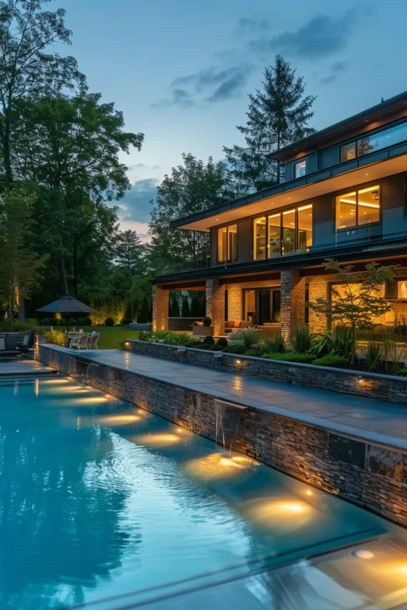 I can’t get enough of how effortlessly chic this space feels! The combination of modern lighting and natural elements like the stone wall and plants gives it such a calming vibe, making it feel like a true escape right in your own backyard. The pool lighting especially brings a soft glow that makes it perfect for evening lounging with friends or family. It’s the kind of place where you could easily spend hours without even realizing the time passing by! Just picture yourself relaxing here, it’s total bliss.