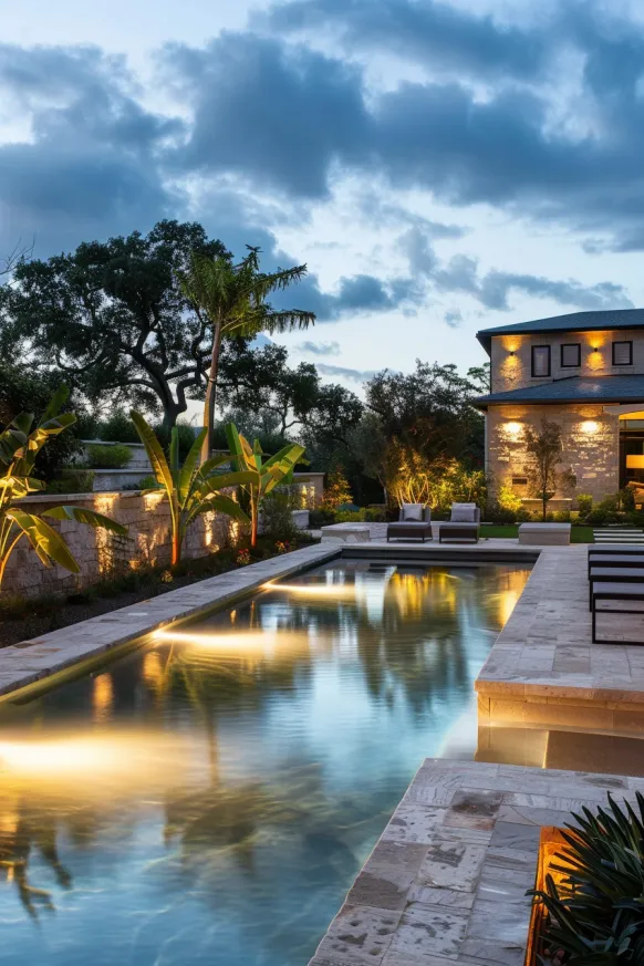 I absolutely love how the lighting adds so much character to this space. The combination of soft poolside lighting with the dramatic shadows cast by the palm trees gives this pool area a resort-like atmosphere. It’s the kind of place where you’d want to relax under the stars or entertain friends during a warm evening. The balance between the lighting and landscaping creates such a tranquil, yet lively, ambiance. It feels like a slice of paradise!