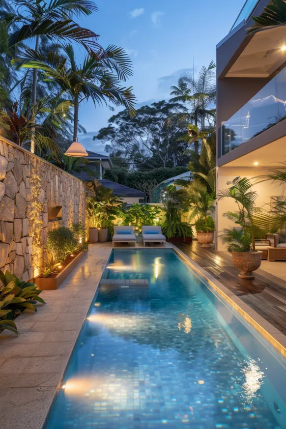 This chic pool design offers a serene yet stylish atmosphere, blending contemporary architecture with lush greenery. The pool is illuminated with soft, under-water lighting, creating a glowing reflection that beautifully complements the surrounding tropical plants. The stone wall adds a rustic touch while the modern furniture creates a sleek, welcoming space for relaxation. The lighting accentuates the clean lines of the design, and the overall aesthetic feels fresh and inviting.