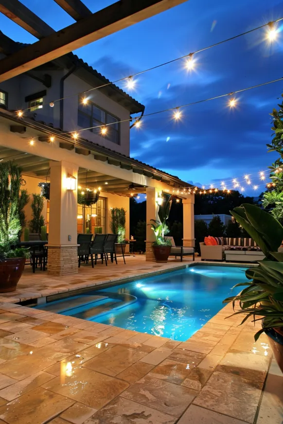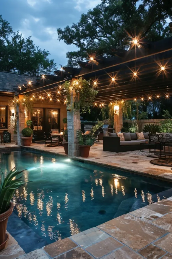 This outdoor space is perfect for anyone looking to create a cozy yet sophisticated atmosphere. The pool is surrounded by a beautifully paved patio, where large plants add a touch of greenery. Overhead, string lights dangle from the pergola, casting a soft, warm glow that highlights both the seating area and the water. The lighting reflects off the pool’s surface, adding a dreamy effect that makes the entire space feel magical as the day transitions to evening.