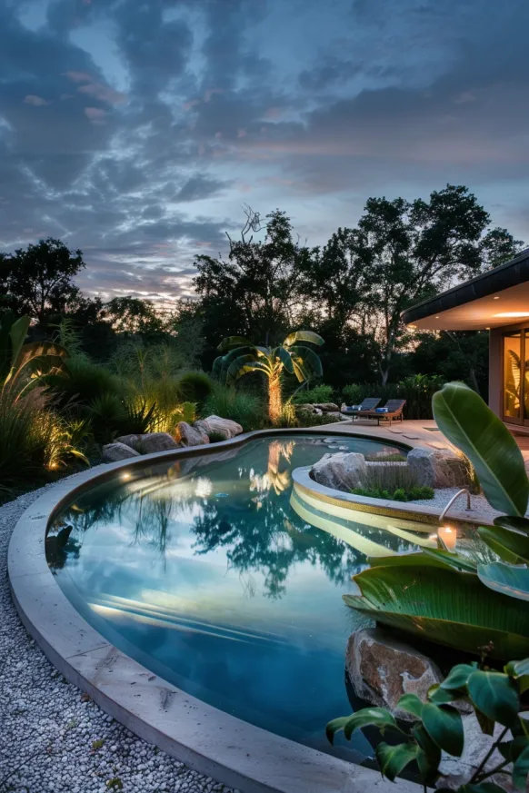 I absolutely adore how this design feels like an escape to nature! The way the soft pool lighting reflects off the water and brings attention to the gorgeous greenery and stones is just so calming. It’s the perfect spot to unwind, whether you’re having a quiet evening alone or spending time with friends. The blend of modern design with natural elements gives the space an effortless charm, and I can totally picture myself enjoying every moment in this dreamy poolside oasis!