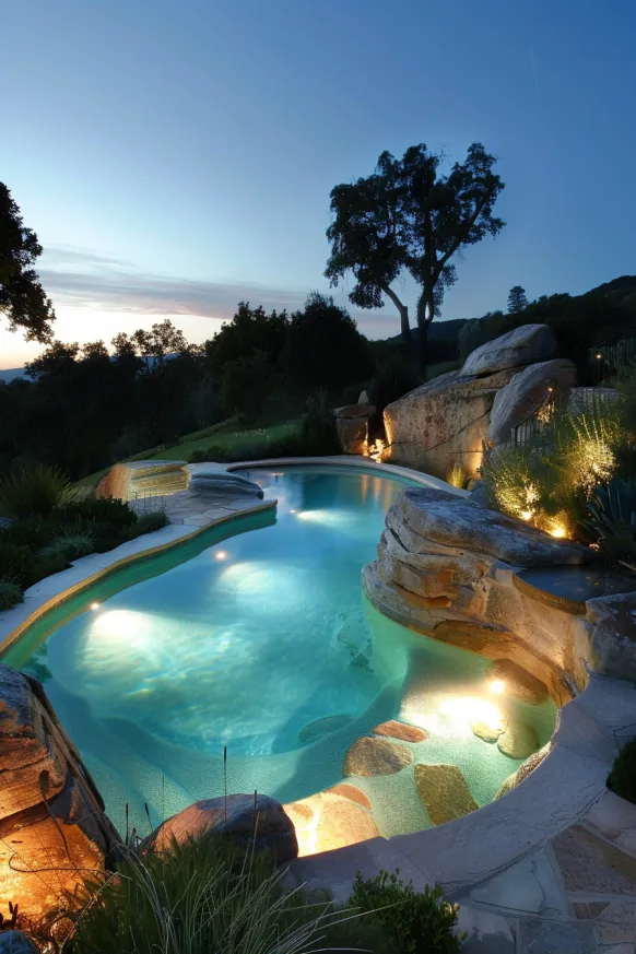 Cozy Pool with Natural Rock Features and Ambient Lighting