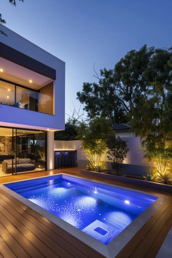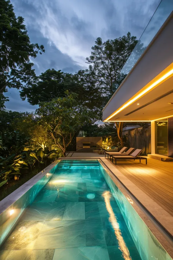 I’m absolutely in love with how the design effortlessly blends modern elegance with natural beauty. The soft lighting gives the pool an almost ethereal glow, and I can just picture enjoying a quiet evening under the stars, with the water shimmering and the ambiance creating the perfect relaxing atmosphere. The minimalist style of the pool and the clever use of lighting make it feel both luxurious and intimate, which I think is simply perfect for unwinding after a busy day.