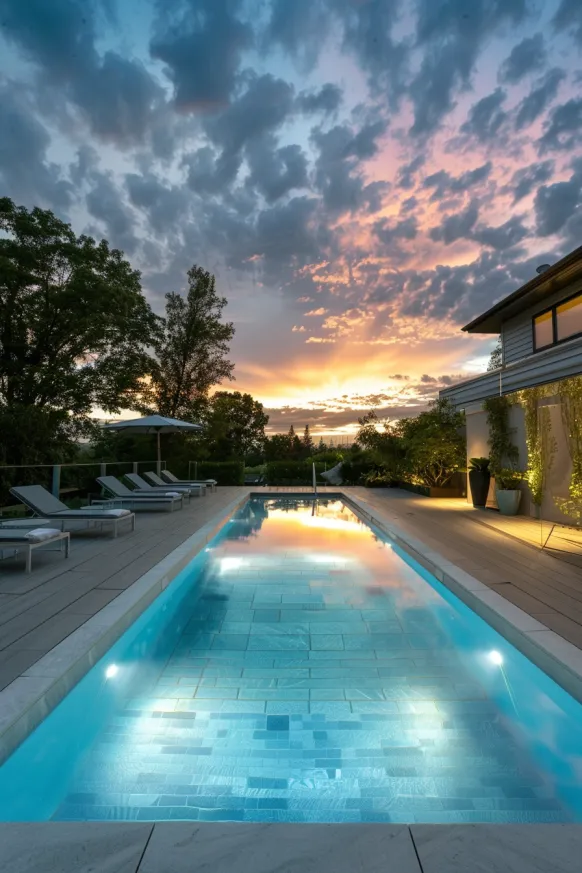 This minimalist pool design takes full advantage of its gorgeous sunset views, framed by sleek loungers and lush green plants. The soft pool lighting highlights the water’s clear blue hues, creating a calm and inviting atmosphere as the day turns to night. The pool’s geometric lines and the surrounding smooth stone deck give it a modern, clean look, while the warm glow from the lighting adds a soft, romantic touch to the entire space. With a clear, unobstructed view of the sky, this pool feels like the perfect spot to relax and unwind.