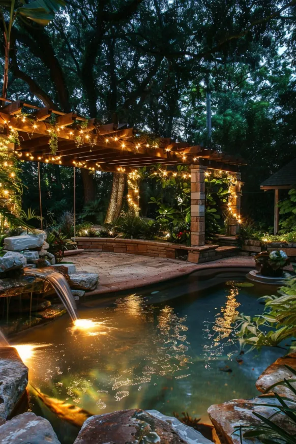 Cozy Garden Retreat with Glowing Pergola and Waterfall
