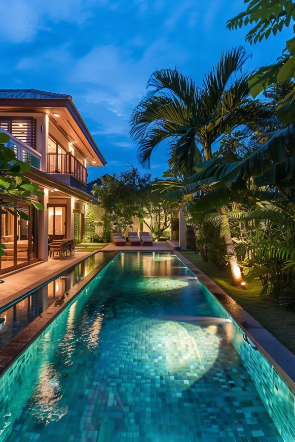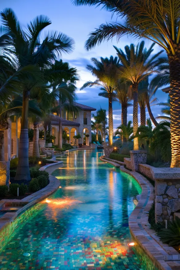 I’m absolutely in awe of how this design uses lighting to elevate the entire space. The combination of vibrant tiles and the soft glow of the lights gives the pool an almost magical quality. I can picture myself walking along the lit-up path, soaking in the gorgeous view of the pool and the tropical ambiance. It’s the kind of space that makes you feel like you’re on vacation every single day! The mix of luxurious and natural elements really makes this pool something special.