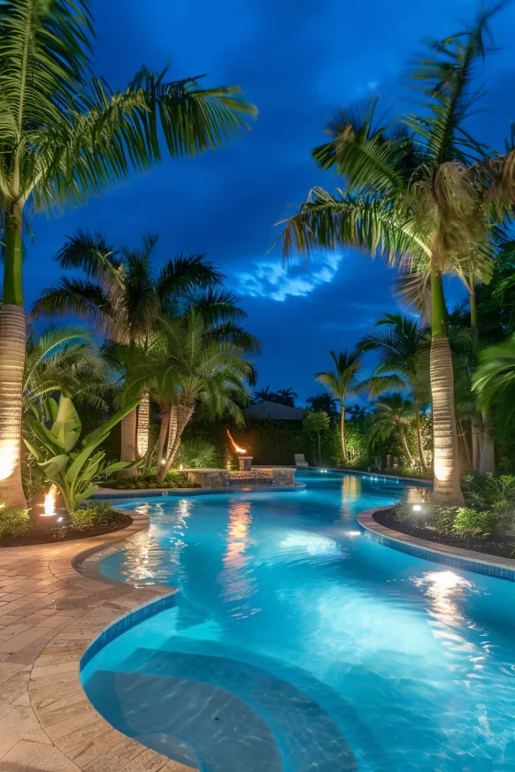 Lush Tropical Pool Lighting for Nighttime Elegance