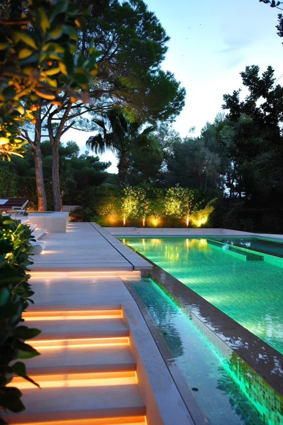 This modern pool design is highlighted by a minimalist, elegant setup with sleek lighting accents that enhance the overall beauty of the space. The illuminated steps leading down to the pool are strategically placed to guide the way while adding a stylish glow to the poolside. The lighting along the edges of the pool casts a soft yet dramatic effect on the water, creating a tranquil, luxurious ambiance that is perfect for nighttime relaxation. Lush greenery around the pool is softly lit, adding depth and warmth to the entire area.