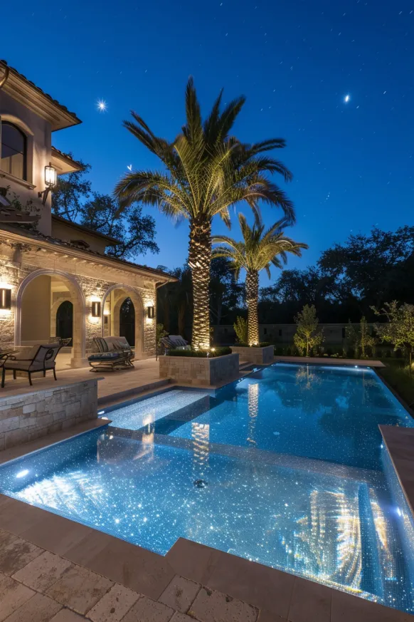This luxurious pool design feels like a peaceful retreat under the stars. The crystal-clear water sparkles with a mesmerizing glow from the submerged pool lighting, creating a magical effect that reflects off the sparkling tiles. The lush palm trees and surrounding garden are softly lit, enhancing the tropical atmosphere of this backyard oasis. The soft, warm lighting from the lantern-style lights on the house’s columns adds an elegant touch to the overall look.