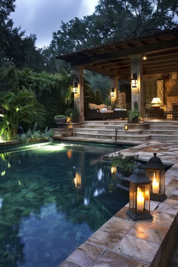 I’m absolutely in love with the warmth and coziness of this design. The lanterns really set the mood, giving the space a relaxed and intimate feel, while the lighting around the pool adds just enough magic to make the area feel like a hidden retreat. This space would be perfect for winding down after a long day, hosting a quiet gathering, or just enjoying some time to yourself. It’s the perfect mix of natural beauty and soft lighting, making everything feel peaceful and inviting.