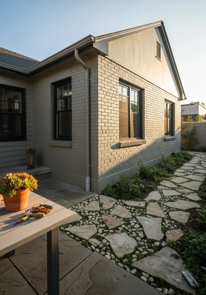 This beautiful side yard view highlights a painted brick exterior in a mid-tone greige that offers a sophisticated and updated look to a classic material. The neutral walls provide a steady backdrop for the dark-trimmed windows and the various architectural levels of the home. Leading away from the house is a stunning flagstone path with organic shapes and river rock infill, surrounded by lush green groundcover and delicate garden plants. A simple wooden table in the foreground, topped with a terra cotta succulent pot and gardening tools, hints at a life spent enjoying the outdoors.