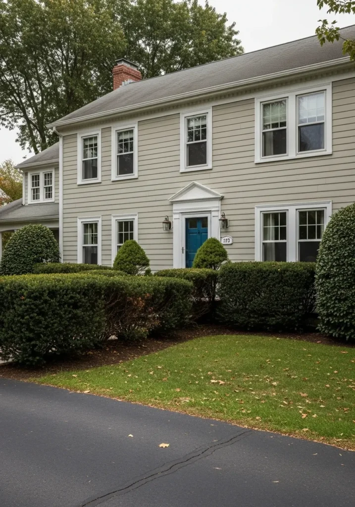 The way that teal-blue door just pops against the sage-leaning walls is such a clever design choice. I really admire how the crisp white trim keeps the whole look from feeling too heavy or dark despite the overcast sky. It is a total dream for anyone who loves a traditional look but wants to move away from basic beige or stark white. Seeing this home makes me want to spend a quiet afternoon gardening behind those perfectly trimmed bushes.