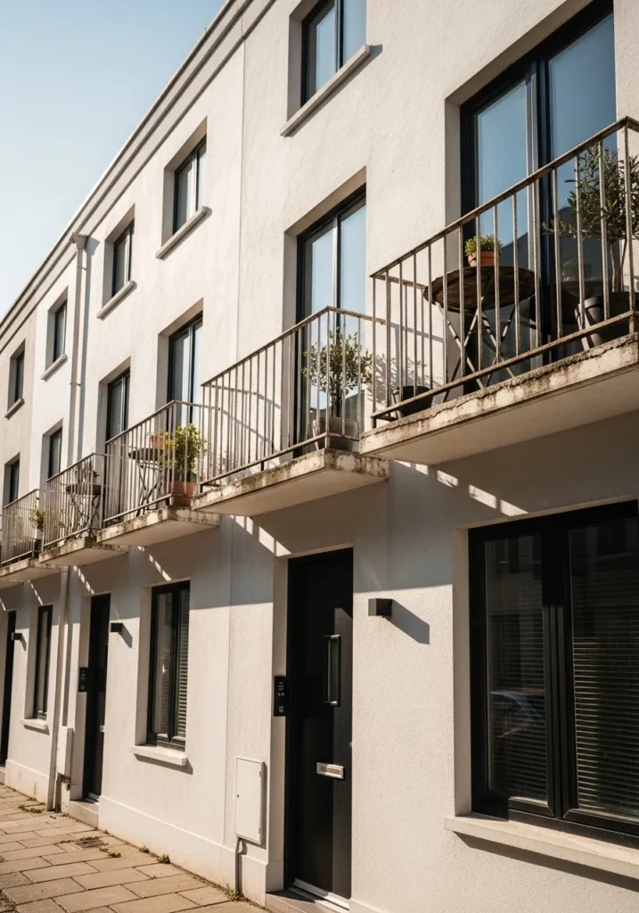 This design features a row of elegant townhomes with a smooth stucco finish in a creamy, sun-drenched white. Each unit boasts a charming balcony with thin metal railings and floor-to-ceiling glass doors that invite plenty of natural light into the living spaces. The stark black trim on the windows and front doors provides a sharp, rhythmic contrast against the pale facade, while simple potted olive trees add a touch of Mediterranean flair. It is a fantastic example of how a bright neutral can make a multi-unit building feel cohesive, spacious, and incredibly high-class.