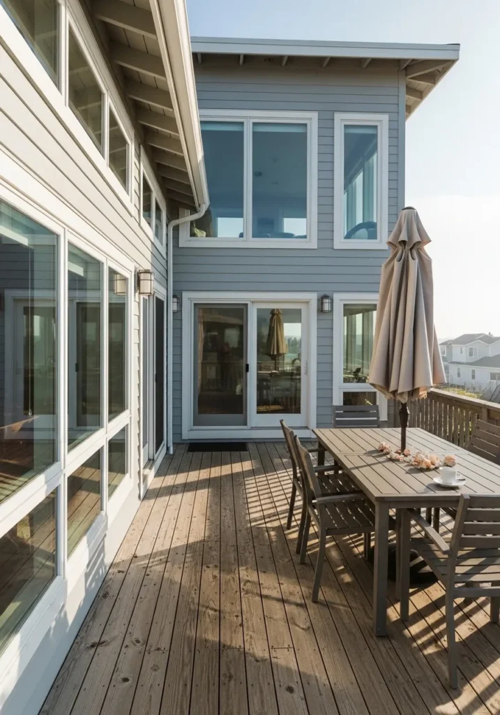 This gorgeous exterior setup features classic horizontal siding in a warm, stone-inspired gray that feels both elevated and cozy. The architecture is defined by oversized white-trimmed windows and glass doors that create a seamless transition between the airy indoors and the weathered wood decking. A large dining table set with sea shells and a morning coffee sits under the shade of a taupe umbrella, making the whole deck feel like a functional outdoor room. The shadows of the railing dance across the planks, emphasizing the relaxed and breezy atmosphere of this multi-level home.