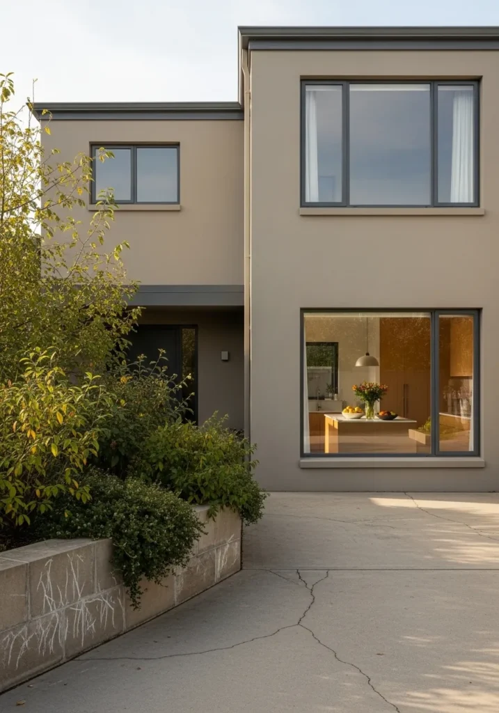 This minimalist exterior showcases a masterclass in using warm neutrals to soften sharp, geometric architecture. The smooth stucco finish is bathed in a rich greige that bridges the gap between cozy beige and trendy gray, creating a seamless look against the concrete driveway. Dark charcoal frames on the large windows provide a bold contrast, while a peek into the kitchen reveals warm wood cabinetry that echoes the earthy tones of the paint. Lush green shrubbery in the foreground adds a burst of natural life that grounds the entire contemporary structure.
