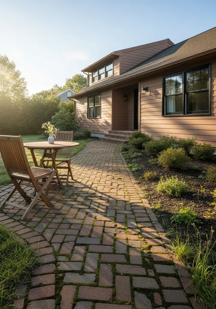 This charming single-story home features horizontal lap siding in a muted, rosy-brown hue that feels deeply connected to the surrounding landscape. The architecture is defined by a classic gabled roof and black-trimmed windows that offer a sharp, modern edge to the rustic color palette. A winding brick pathway leads through a garden of low-profile shrubs and perennials, while a wooden bistro set creates an inviting spot for morning coffee. The way the golden hour sun hits the side of the house highlights the soft textures of the wood and the organic variations in the stone walkway.