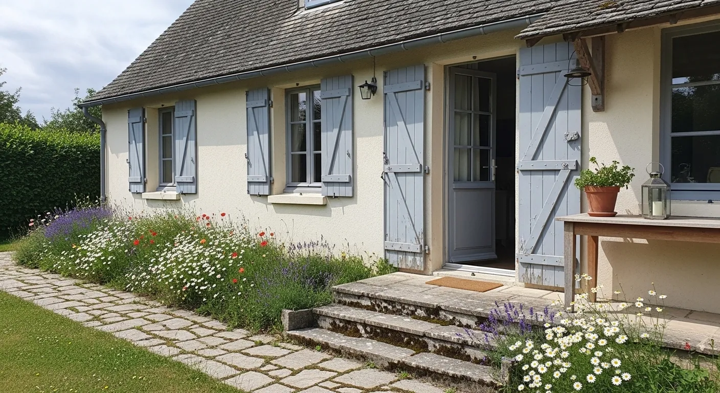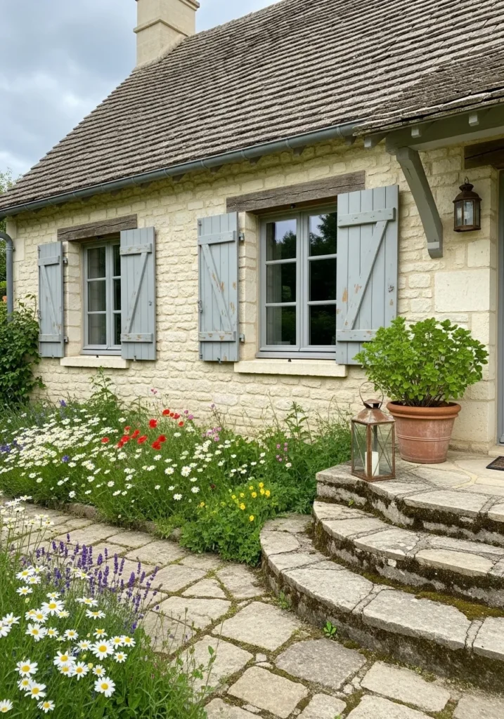 This enchanting stone cottage looks like it was plucked straight from a fairytale with its creamy limestone walls and weathered blue shutters. The shutters feature a soft, greenish-blue hue that mimics the delicate colors of a coastal morning, adding a touch of Provencal charm to the rugged stone texture. A whimsical garden filled with daisies, poppies, and lavender spills over the cobblestone path, while a rustic lantern sits ready to light up the curved stone steps. The exposed wooden lintels above the windows ground the ethereal paint color with a bit of raw, natural history.