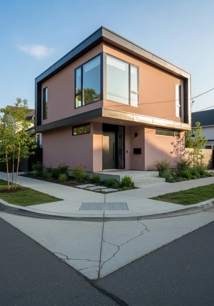 To me, this color choice is absolutely genius for such a daring structure. It takes some serious confidence to wrap a geometric home in a soft pinkish-mauve, but it works so well because it feels intentional and organic against the blue sky. The way the late afternoon shadows play across those flat surfaces is just stunning. It is the perfect inspiration if you want your home to be the talk of the neighborhood for all the right reasons.