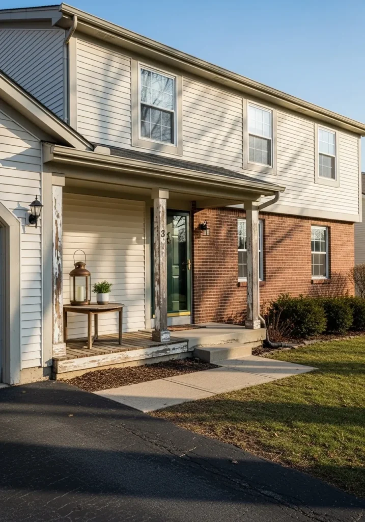 Walking up to this house feels like getting a warm hug from an old friend. I’m quite fond of how the soft beige tone tames the vibrancy of the brickwork without making the house look washed out. It’s incredibly clever to pair such a reliable neutral with those distressed wood accents because it creates that coveted “lived-in” charm we all crave. This design proves that you don’t need a million bells and whistles to create a facade that looks absolutely lovely and full of character.