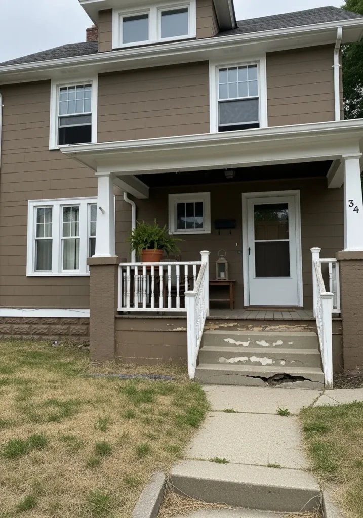 Looking at this house makes me want to grab a coffee and just sit on those steps all morning. The way the dark trim anchors the lighter siding is such a smart move because it adds a punch of personality without feeling loud. I genuinely admire how the designer used simple textures like the potted plants and metal watering can to make the front porch feel lived in and sweet. It really feels like a calm oasis right in the middle of a busy neighborhood.
