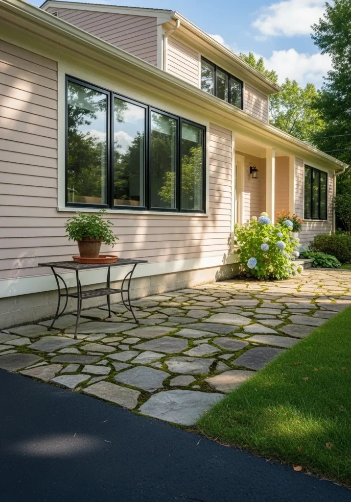 This charming suburban home features a horizontal lap siding in a very delicate, warm-toned neutral that almost feels like a whisper of color. The architecture is accented by sleek black window frames that provide a sharp, modern contrast against the light-filled walls. A beautiful flagstone patio with mossy joints leads up to the entrance, where a cluster of blue hydrangeas adds a soft pop of natural beauty. The creamy white trim along the base and roofline ties the whole look together, making the house feel bright and airy even in the shade of nearby trees.