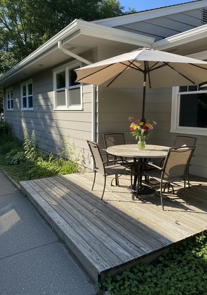 I am genuinely impressed by how this design balances cool neutrals with such vibrant wooden textures. It feels like the ultimate spot for hosting a sunset wine night with your best friends. The choice of a slightly warmer gray for the siding is a masterclass in making a modern home feel cozy rather than clinical. I truly appreciate how the simple addition of white flowers on the table pulls the whole look together, making the deck feel like a direct extension of the living room.
