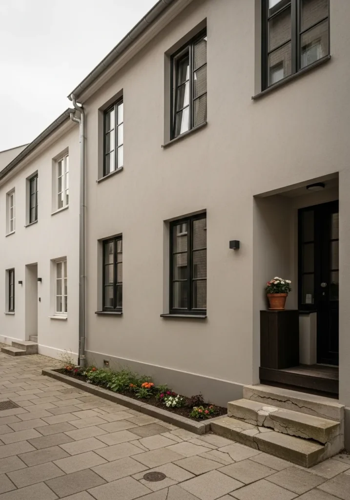 This urban townhome showcases a smooth stucco finish in a quintessential neutral that balances warm and cool tones with ease. The architecture features a clean, flat facade punctuated by black-framed windows and a recessed entryway that adds depth to the minimalist structure. A small, built-in flower bed at the base brings a pop of floral color against the stone-paved walkway, while a potted plant on a dark pedestal creates an inviting focal point near the door. The overall look is incredibly streamlined, proving that simple shapes and the right paint can create a very high-end curb appeal.