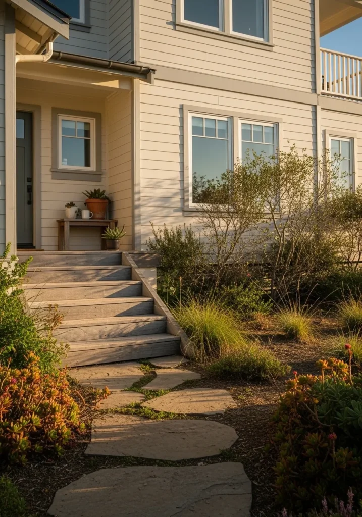 This stunning home features a sophisticated exterior wrapped in a warm, stone-like neutral that perfectly complements the desert-inspired landscaping. The architecture is wonderfully clean, with large picture windows and a simple, elevated front porch that invites you to sit and stay a while. To add a bit of contrast, the window trim and door are finished in a soft, medium gray that keeps the look modern without feeling too harsh. The weathered wooden steps and flagstone path lead through a variety of succulents and ornamental grasses, creating a space that feels deeply connected to the natural world.