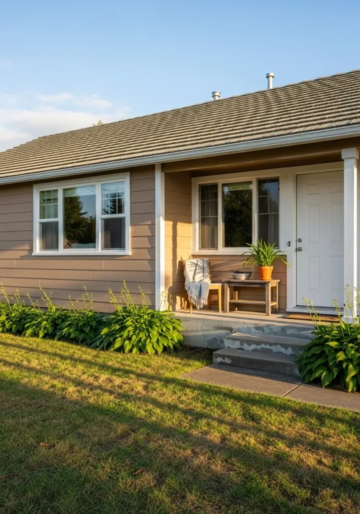 This charming ranch-style home radiates a sense of warmth with its horizontal siding painted in a rich, mid-tone greige. The color has a wonderful earthiness that feels solid and dependable, especially when paired with the bright white trim and front door. A small concrete porch serves as a perfect little nook for a wooden bench and potted plants, all set against a lush green lawn and healthy hostas that line the foundation. The golden hour sunlight hitting the facade emphasizes the beautiful taupe undertones that make this neutral feel so much more interesting than a standard tan.