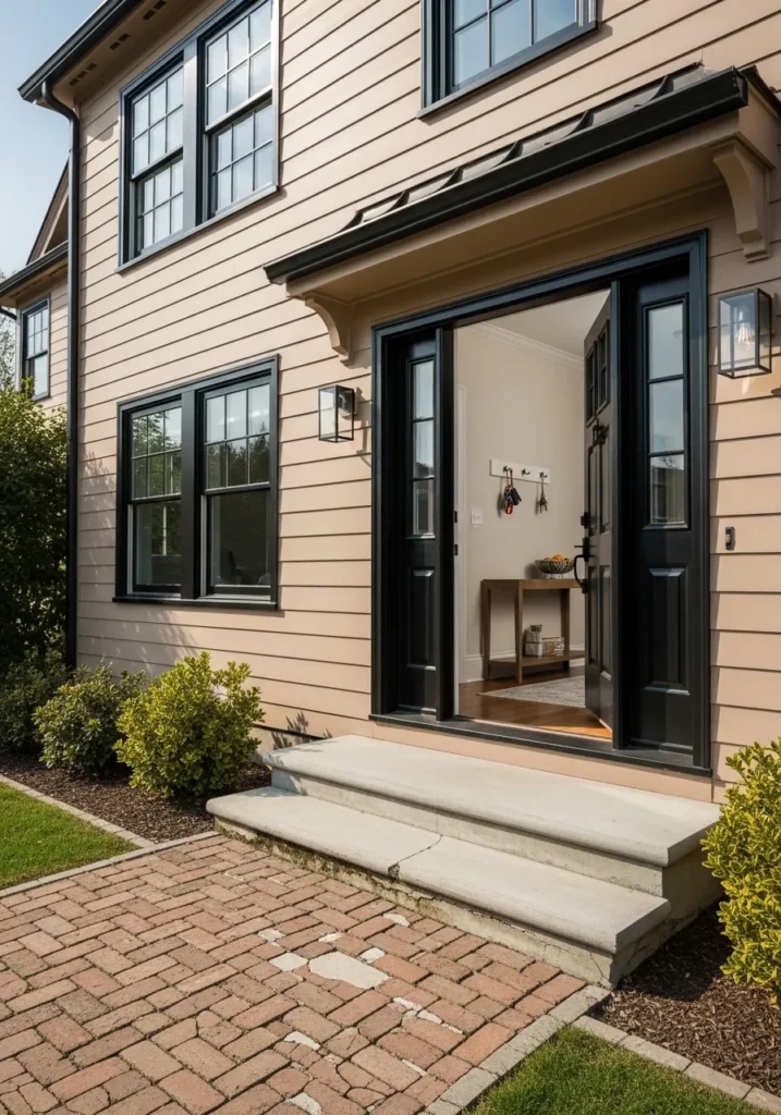 This stunning exterior shows off horizontal lap siding in a warm, sandy tan that feels incredibly upscale against the bold black accents. The dark window frames and matching front door create a sharp, high-contrast look that defines the entryway and draws the eye inward. Below the concrete steps, a rustic brick paver walkway adds a touch of traditional texture that grounds the more modern elements of the home. It is a fantastic example of how to mix different eras of design to create something that feels entirely fresh.